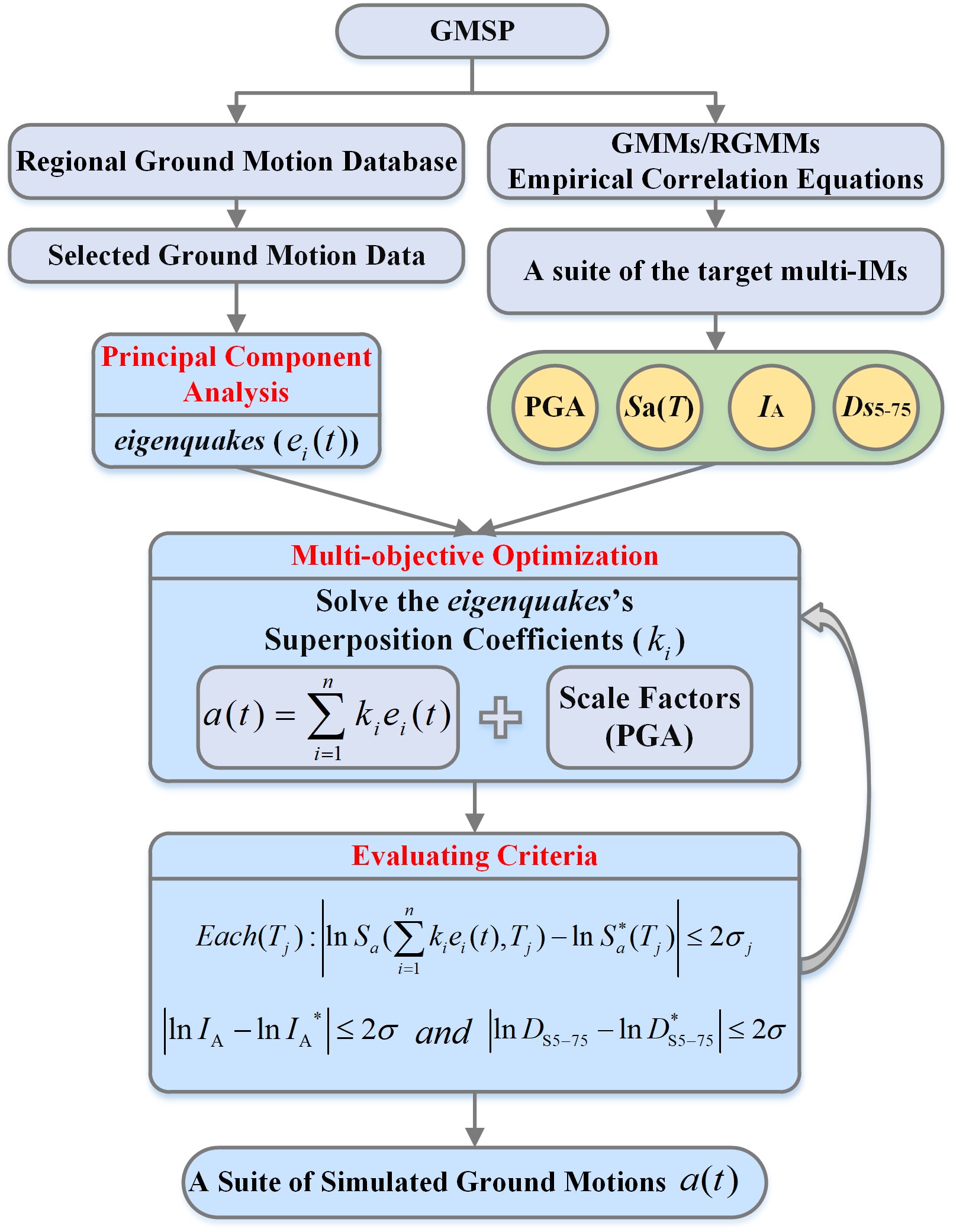 本研究構(gòu)建了一套基于特征提取匹配多強(qiáng)度指標(biāo)的地震動(dòng)模擬程序(GMSP,見(jiàn)圖1)。該地震動(dòng)模擬程序的目的是在設(shè)定地震情景下為單一場(chǎng)點(diǎn)生成一組充分考慮地震動(dòng)幅值、頻譜、持時(shí)和累積能量的加速度時(shí)程。多個(gè)標(biāo)量地震動(dòng)強(qiáng)度指標(biāo)被選取建立了目標(biāo)矢量強(qiáng)度指標(biāo)([IA, DS5-75, PGA, SA(T)]),該矢量強(qiáng)度指標(biāo)被用于在模擬過(guò)程中控制擬合優(yōu)度。GMSP通過(guò)將一組實(shí)際地震動(dòng)記錄經(jīng)主成分分析方法(PCA)特征提取后得到一組標(biāo)準(zhǔn)的正交基向量,即eigenquakes。采用多目標(biāo)遺傳算法結(jié)合約束條件進(jìn)行迭代尋優(yōu),求解每個(gè)eigenquake對(duì)應(yīng)的線(xiàn)性疊加系數(shù)。最終,在時(shí)域上完成縮放疊加得到模擬地震動(dòng)記錄。