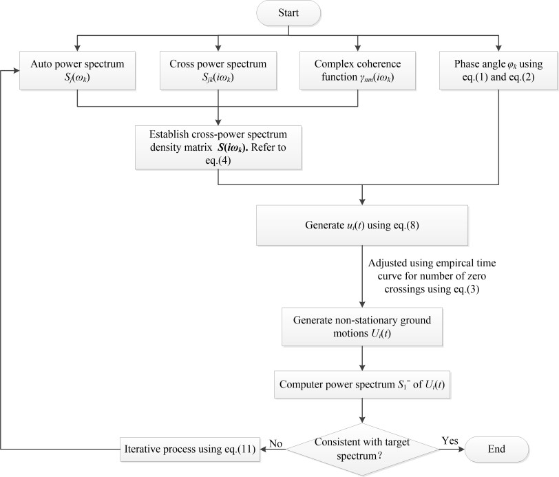 地震動(dòng)的頻域非平穩(wěn)性可通過(guò)累積穿零量隨時(shí)間變化進(jìn)行描述,在傳統(tǒng)譜表達(dá)合成地震動(dòng)的基礎(chǔ)上分別引入相位差譜和累積穿零量對(duì)合成結(jié)果進(jìn)行強(qiáng)度、頻域非平穩(wěn)化。利用CESMD數(shù)據(jù)庫(kù)中豐富的地震動(dòng)記錄擬合出相位差譜隨震級(jí)、震中距變化模型,以及累積穿零量隨時(shí)間變化的經(jīng)驗(yàn)?zāi)P停俅肟臻g相干函數(shù)拓展為多點(diǎn)非平穩(wěn)地震動(dòng),改進(jìn)后方法流程如圖1。由圖2可知,所模擬的地震動(dòng)時(shí)程不僅具有強(qiáng)度及頻域非平穩(wěn)性,同時(shí)體現(xiàn)了空間多點(diǎn)的相干性。將上述合成的地震動(dòng)通過(guò)一大跨橋梁進(jìn)行多點(diǎn)地震動(dòng)輸入驗(yàn)證,討論了一致和非一致輸入下的結(jié)構(gòu)響應(yīng)差異。