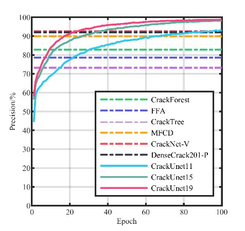 在混凝土結構的服役周期內,表面裂縫是一種評價混凝土結構健康狀態的重要指標。但是無論是在實驗室中還是在實際工程中,識別裂縫都是一項非常復雜的任務。而人工識別裂縫存在著各種缺陷,包括耗費時間長、評估主觀等。隨著計算機視覺技術的發展,使用計算機視覺技術自動話地識別混凝土裂縫成為當下研究的熱點。但是計算機視覺識別裂縫依然存在一些問題,包括無法實現像素級的檢測,檢測精度不高等問題。