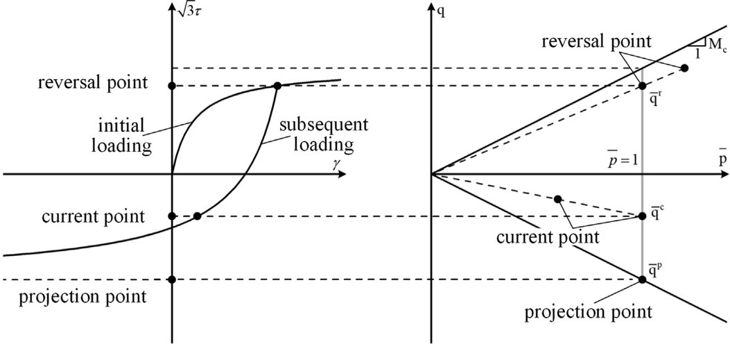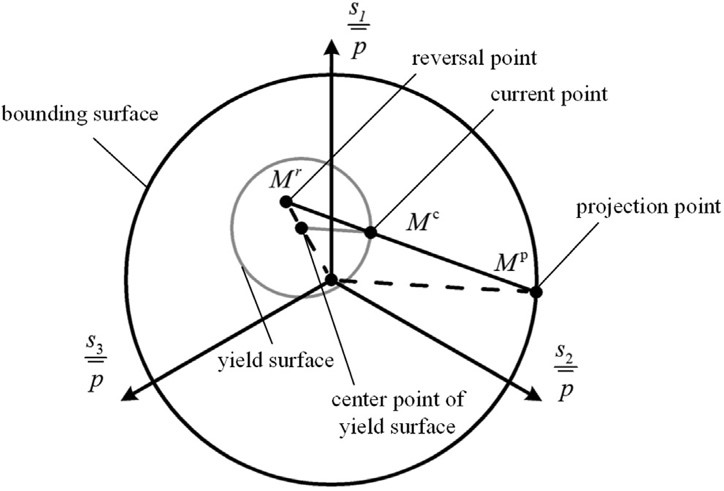 1.本文首先提出了一個(gè)便于工程應(yīng)用的三維土體彈塑性本構(gòu)模型。本模型基于邊界面模型理論,在歸一化偏平面中建立投影法則給出應(yīng)力狀態(tài)參量(見圖1);采用土體材料模量與圍壓的經(jīng)驗(yàn)關(guān)系描述圍壓改變引起的土體模量變化;并根據(jù)偏應(yīng)力不變量建立應(yīng)力等效關(guān)系,將一維Pyke模型拓展到三維應(yīng)力空間并以此推導(dǎo)塑形模量(見圖2)。