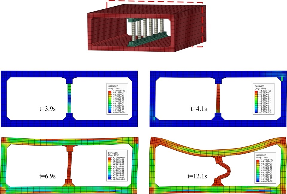 城市地下空間的開發(fā)充分利用了城市空間資源,為人們的生活提供了極大的便利。然而,歷次大地震震害調(diào)查表明地下結(jié)構(gòu)面臨較大的地震災(zāi)害風(fēng)險(xiǎn)。國(guó)內(nèi)外的研究學(xué)者針對(duì)著名的1995年阪神地震中大開車站地震破壞案例進(jìn)行了大量的研究,然而大多數(shù)的研究都沒有實(shí)現(xiàn)對(duì)大開車站倒塌演化全過程的模擬;結(jié)構(gòu)的承載能力通常具有一定的冗余度,某一結(jié)構(gòu)構(gòu)件實(shí)效會(huì)引起結(jié)構(gòu)性能的退化,以往的研究中未給出大開車站性能退化過程,因此對(duì)于其破壞機(jī)理的解釋仍存在一定的局限性。本文給出了能夠重現(xiàn)地下結(jié)構(gòu)倒塌過程的非線性時(shí)域數(shù)值模擬方法,重現(xiàn)了阪神大地震中大開車站的災(zāi)變演化過程,并對(duì)由于中柱實(shí)效而引起的矩陣地下結(jié)構(gòu)抗震性能退化機(jī)理進(jìn)行了研究。
