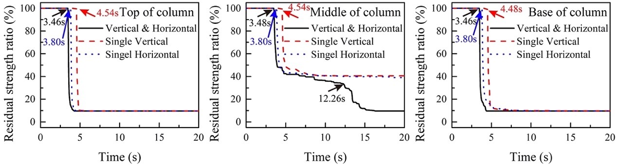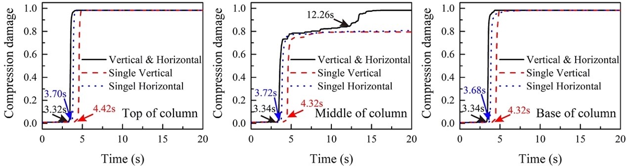 2.本文依據(jù)大開車站的震害調(diào)查資料,建立三維非線性有限元模型(見圖3),采用時(shí)域動(dòng)力顯式有限元分析方法重現(xiàn)了大開車站在雙向地震動(dòng)共同作用下的坍塌過程及其“M”型破壞模式(見圖4),給出了中柱混凝土實(shí)效演化過程(見圖5)。