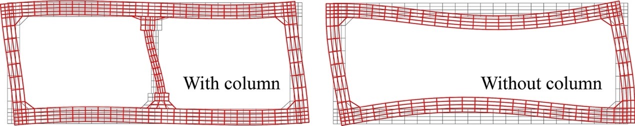3.根據(jù)數(shù)值模擬得到的結(jié)構(gòu)變形演化過程(見圖6),可以將大開車站的破壞分為三個(gè)階段:I)中柱在水平和豎向地震動(dòng)共同作用下失效;II)中柱承擔(dān)的上覆土和后續(xù)地震荷載向頂板轉(zhuǎn)移,并引起頂板混凝土損傷發(fā)育;III)頂板破壞沉降引起結(jié)構(gòu)整體垮塌。通過對(duì)比有無中柱截面的地震變形模式(見圖7),可知結(jié)構(gòu)幾何形狀(頂板和側(cè)壁的剛度比)對(duì)地下結(jié)構(gòu)的地震響應(yīng)有很大的影響;頂板的剛度大于側(cè)墻的剛度,有利于地下結(jié)構(gòu)的抗震。