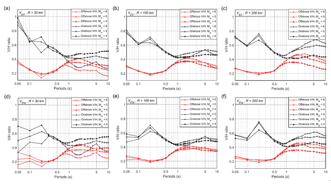 2)為了深入分析海/陸地震動(dòng)輸入能量在水平與豎向的差異,分析了海底V/H輸入能量譜比,并與陸地地震動(dòng)比較。結(jié)果表明,海底V/H輸入能量譜比與陸域譜比在震級(jí)、距離和周期等方面都存在較大差異,海底地震動(dòng)的V/H輸入能量譜比在短周期均明顯小于陸地地震動(dòng),同時(shí)海底臺(tái)站間的V/H輸入能量譜比也存在較大的差異(見(jiàn)圖3)。